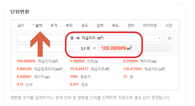 ⑤ 위와 같이 '넓이' 탭에서 평을 제곱미터로 바꾸면 33평은 109.090909제곱미터로 환산되어서 간편하게 계산되어서 나옵니다.