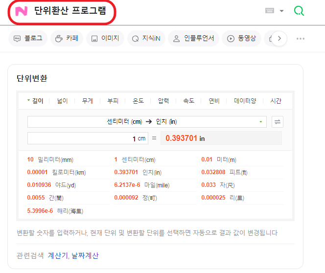 ①온라인에서 간단히 계산이 가능한 거리 단위 환산 프로그램을 사용해 보겠습니다. 네이버 사이트에서 '단위환산 프로그'로 검색하면 아래와 같은 화면이 나옵니다.