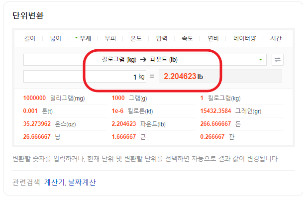 ☞ 그리고, 아래에 빨간색 글씨로 다른 무게 단위들의 결괏값도 같은 화면에 보여줍니다.