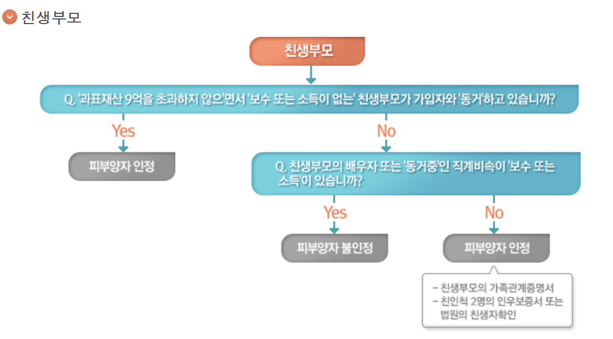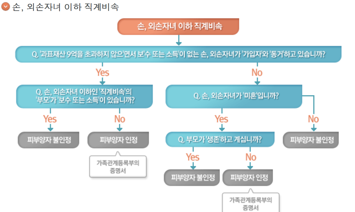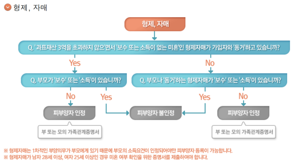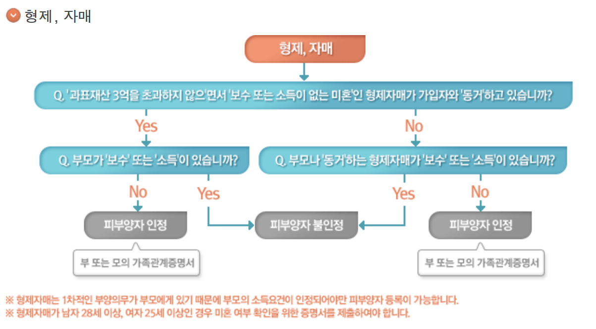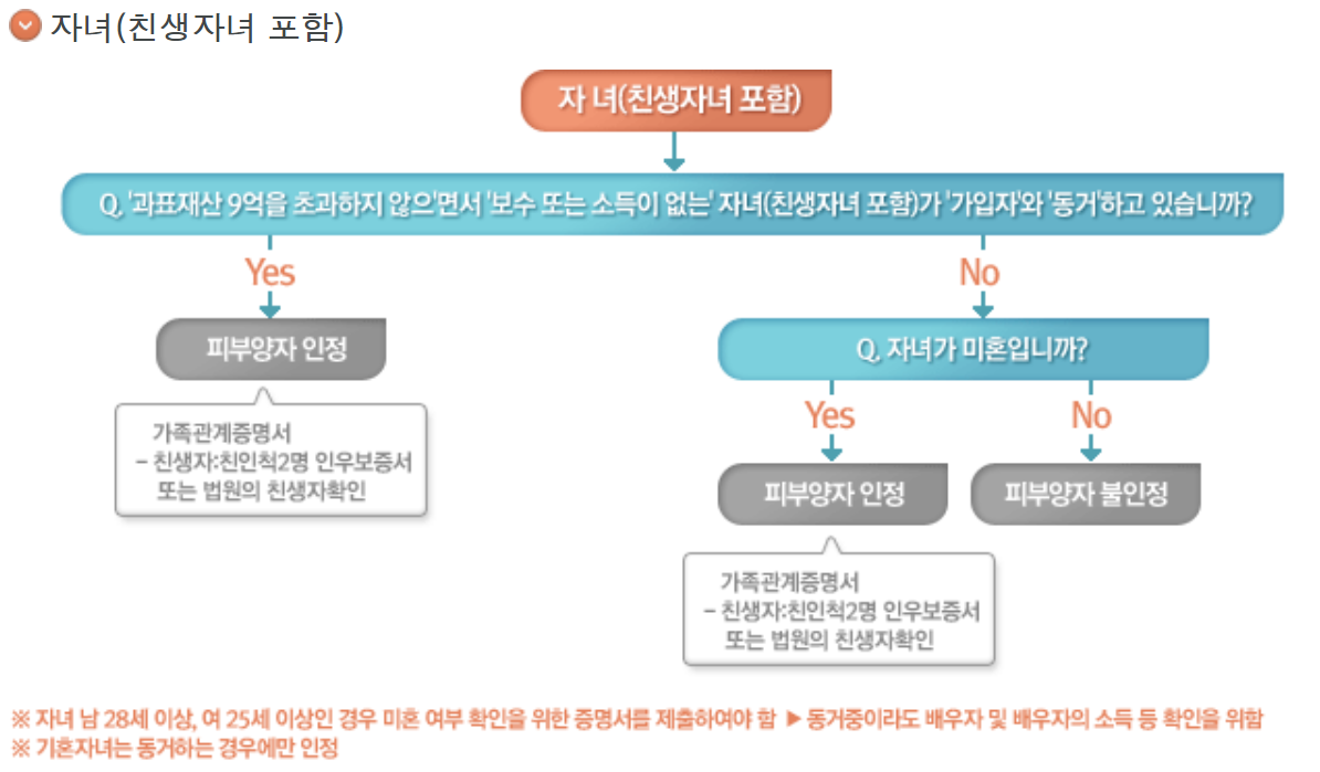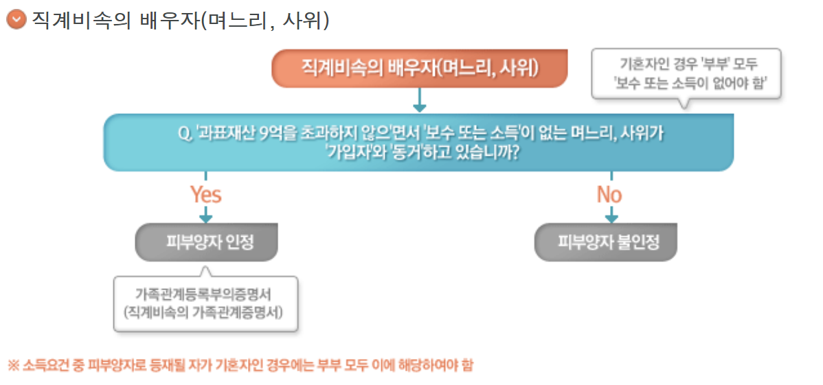 3.가족관계: 가입자의 배우자, 보모, 자녀 등 해당 가족관계에 다라 피부양자 자격조건에 해당되어 집니다.