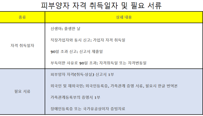 피부양자 자격 취득일자는 다음과 같습니다: 신생아의 경우에는 출생한 날 직장가입자의 자격취득과 동시에 피부양자의 자격취득을 신고한 경우에는 그 가입자 자격을 취득한 날 직장가입자의 자격취득일 또는 가입자의 자격변동일부터 90일을 초과하여 피부양자 자격취득신고를 한 경우에는 국민건강보험공단에 피부양자자격취득신고서를 제출한 날 부득이한 사유로 90일을 초과하여 피부양자 자격취득신고를 한 경우에는 직장가입자의 자격취득일 또는 가입자의 자격변동일 피부양자 자격(취득·상실) 신고서 1부를 제출해야 합니다. 추가로 필요한 서류는 다음과 같습니다: 외국인 및 재외국민(피부양자)의 경우: 외국인등록증 또는 국내거소신고증, 가족관계나 혼인·이혼사실을 확인할 수 있는 서류, 한글 번역본이 필요한 경우 공증기관의 공증을 받은 한글 번역본 가족관계등록부의 증명서 1부(주민등록표등본만으로 가입자와 피부양자의 관계를 알 수 없는 경우) 장애인등록증 또는 국가유공상이자임을 증빙하는 자료 등(부부 모두 해당시는 각각 제출) 공단에서 국가 등으로부터 받은 자료로 사실을 확인 할 수 있는 경우에는 별도의 서류 제출이 필요하지 않습니다.