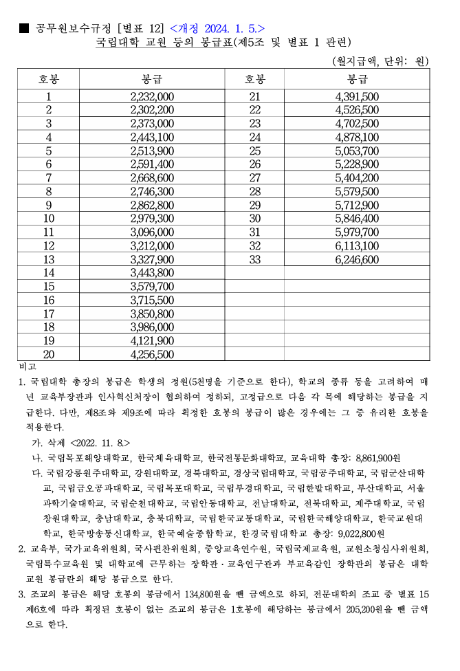 국립대학교 교원도 공무원이라 합니다. 1호봉은 2,232,000원입니다.