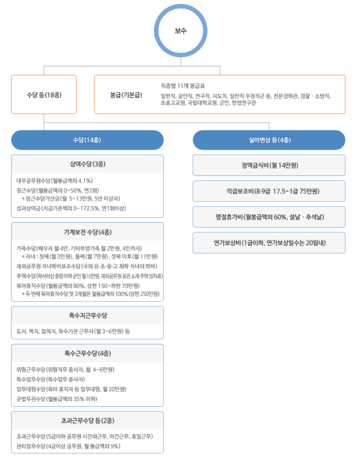 봉급표를 알아보기 전에 먼저, 공무원의 보수체계부터 살펴보아야 전체적인 급여 수준을 알 수 있을것입니다.
