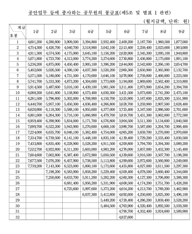 공무원의 보수는 '공무원 보수규정'에 따라 받게 된다고 합니다.2024년 공무원 봉급표 직종별로 봉급표가 다릅니다. 아래에는 '공무원 보수규정'에 따른 정확한 봉급표를 올려두었으니 확인해 보시면 됩니다.