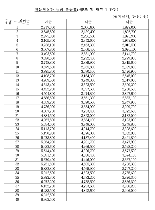 전문경력관은 가군, 나군, 다군으로 나뉘어지고 가군 1호봉은 2,717,000원, 나군 1호봉은 2,050,600원, 다군 1호봉은 1,877,000 원입니다.