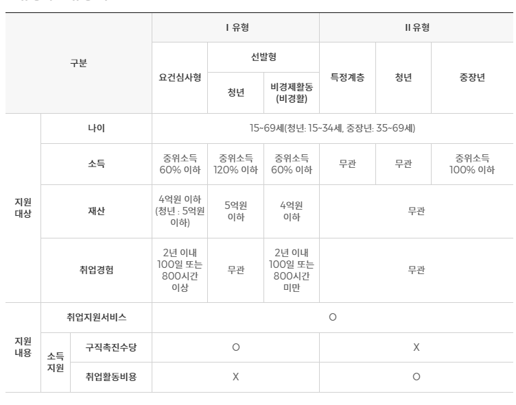 가구단위 중위소득이 60% 이하여야 하며 재산 4억원 (청년은 18세~34세 5억원) 이하여야 합니다. 그리고 최근 2년 안에 100일 또는 800시간 이상 취업경험이 있다면 I 유형에 해당이 됩니다. 그리고 구직촉진수당 및 취업지원서비스를 제공받게 됩니다.