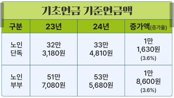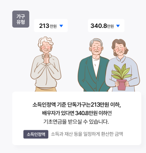 기초연금은 만 65세 이상으로 소득인정액이 선정기준액 이하이면 수급자격이 됩니다. 2024년 단독가구 선정기준액은 213만원이하, 부부가구는 340.88만 원 이하입니다.