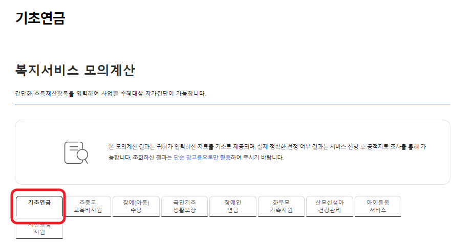 복지로 홈페이지에서 기초연금 자가진단을 통해서 간편하게 기초연금 수급자격 확인을 바로 할 수 있으니 바로 모의계산 해보시기 바랍니다. 위의 바로가기를 클릭하면 기초연금 수급자격확인 모의계산 페이지로 이동합니다.