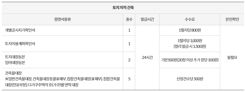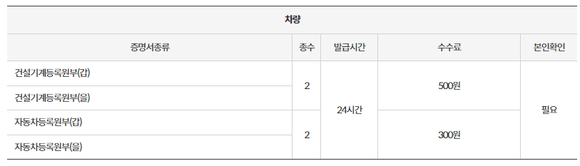 👉 발급 수수료는 아래의 표와 같으나, 개별 법령 혹은 자치단체의 조례에 따라 달라 질 수 있으니 이점도 유의하셔야겠습니다.