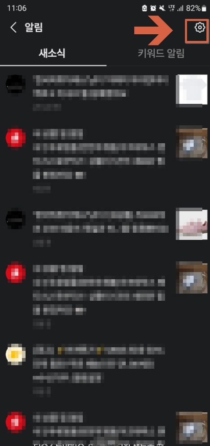 ** 앱 =====> 우측상단 종 모양 클릭 ====> 우측상단 톱니바퀴 클릭 ====> 알림설정