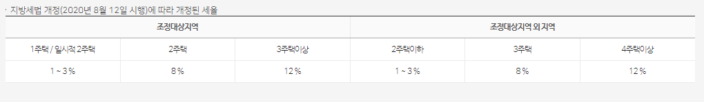 1 가구 2 주택 취득세율의 경우 새로 산 집이 조정대상지역에 있다면 8%의 취득세율이, 그 외 지역이라면 1~3%의 취득세율이 적용됩니다. 3 주택을 소유하는 경우, 조정지역에서는 12%, 그 외 지역에서는 8%의 취득세율이 적용됩니다.
