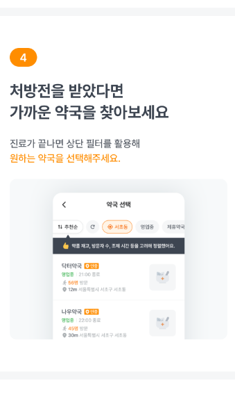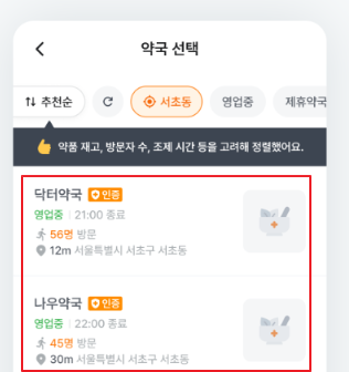 2. 먼저, 선택한 약국에 처방받은 약이 있는지 확인 후 재고가 없다면 자동으로 다른 약국이 추천됩니다.