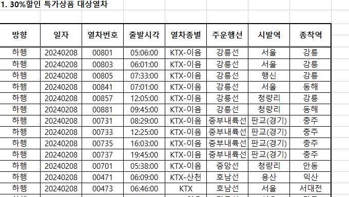 2. 대상열차:특가상품 대상 열차는 2월 8일(목) ~ 2월 9일(금), 2월 11일(일) ~ 2월 12일(월) 기간 중 운행하는 KTX 일부 열차