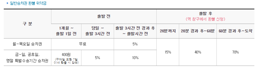 승차권 변경이 필요한 경우에는 반환 후 다시 구입해야 하고 위약금이 발생할 수 있습니다. 그리고 발권한 승차권을 역에서 재발권 하는 경우는 할인이 취소될 수 있습니다.