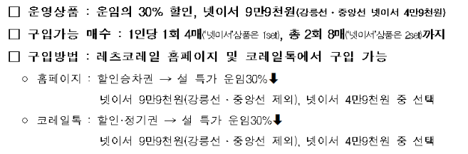 설명절 특가상품 예매는 '레츠코레일' 승차권 예매 페이지 혹은 '코레일톡'앱에서 구매가 가능합니다.
