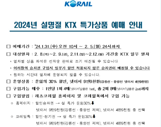 매해 설이나 추석 명절을 맞이해서 교통 전쟁이 펼쳐집니다. 올해 설날 기차표 예매가 이미 끝났지만 한국철도공사(코레일)에서 1월 31일부터 설명절 KTX 30% 할인하는 특가상품을 예매합니다. 대상열차 등을 바로 알아보시고 바로 예매준비하셔서 명절 즐거운 시간 보내시기를 바랍니다. *열차별 좌석은 선착순 판매로 조기 매진 될 수 있으니, 서둘러 확인하셔야겠습니다.