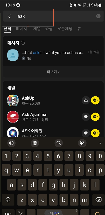 먼저 아숙업(Ask up) 채널 추가