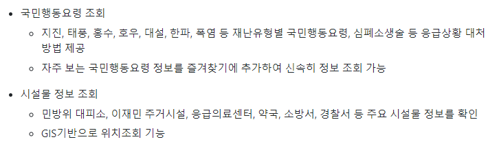 행정안전부에서 제공하는 앱으로 종합 재난 및 안전정보 포털로 운영되고 있으며, 아래와 같은 상황에 대한 자세한 조치 요령을 제공해 줍니다.
