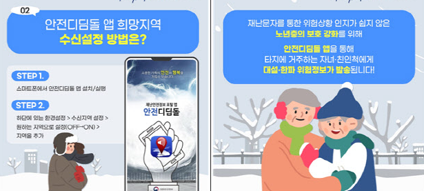 휴대전화 사용에 익숙하지 않은 노인들은 겨울철 대설·한파로 인한 안전사고 위험이 상대적으로 높기 때문에 안전디딤돌 서비스를 적극 활용해 부모님 안부를 확인하고 겨울철 안전도 꼭 챙기시길 바랍니다.