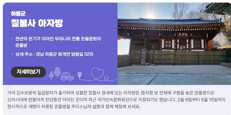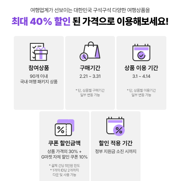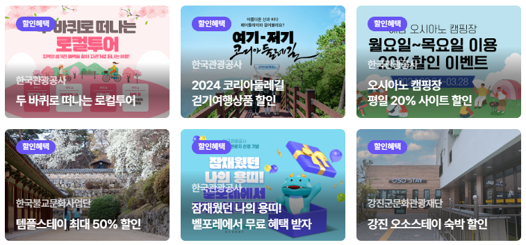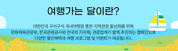 대한민국 구석구석 국내여행을 통한 지역관광 활성화를 위해문화체육관광부, 한국관광공사와 전국의 지자체, 관광업계가 함께 추진하는 캠페인으로 다양한 할인혜택과 여행 프로그램 및 이벤트가 제공되는 문화체육관광부 주관의 혜택입니다.