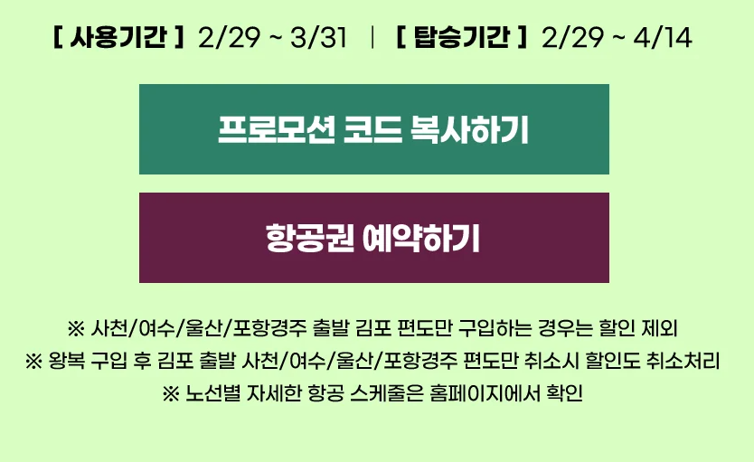 기간은 2월 29일 목요일부터 3월 31일 일요일까지이며 사용기간, 할인금액 등 더 자세한 내용은 아래에서 확인하시기 바랍니다.