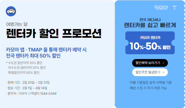 렌터카 예약시 수도권은 10%, 비수도권은 20%가 할인됩니다. 인구감소지역(특별할인지역)은 50%까지 할인된 금액으로 이용할 수 있습니다.