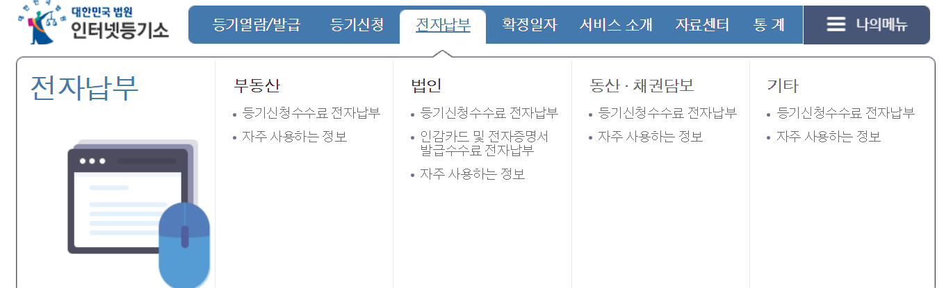 인터넷 등기소 사이트에서는 등기 관련 업무를 인터넷으로 처리할 수 있는 메뉴가 제공됩니다.