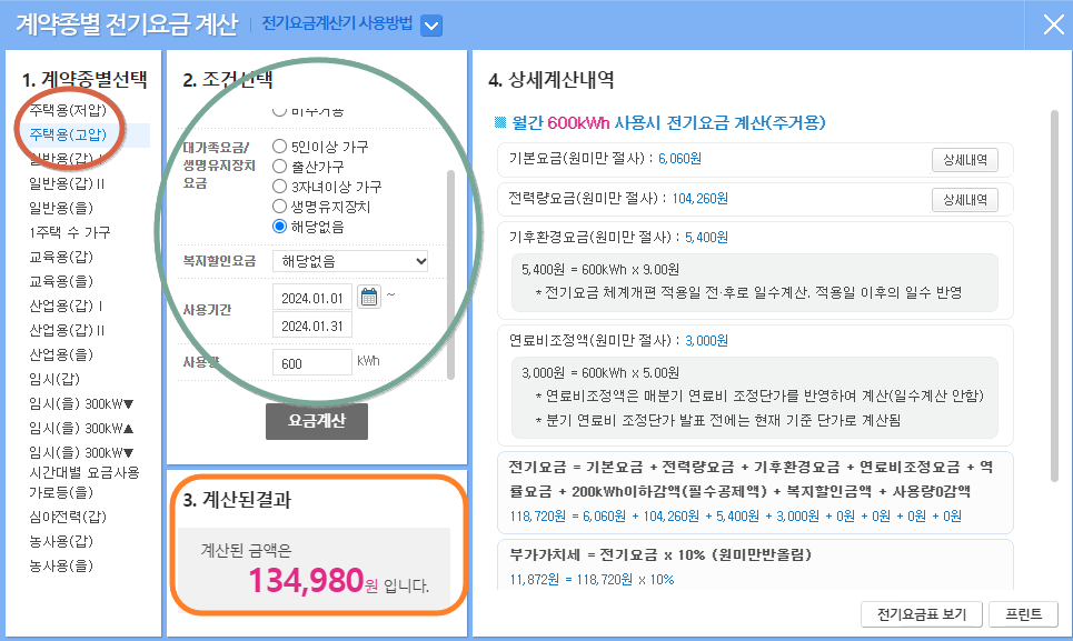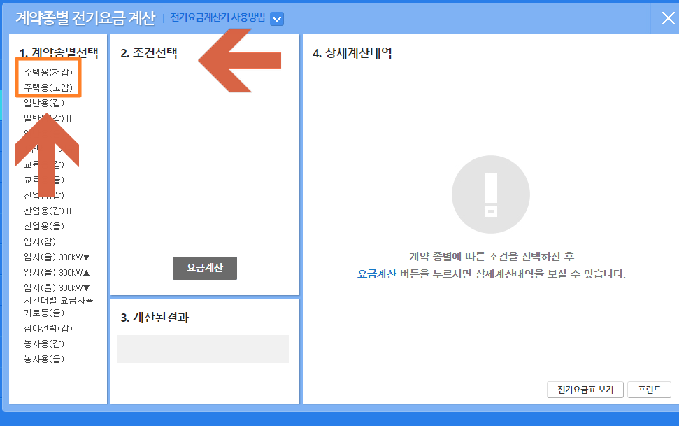 1. 자신의 계약종을 먼저 선택해 주십니다. 대부분 주택용(저압) 혹은 주택용(고압)을 선택하시면 됩니다.