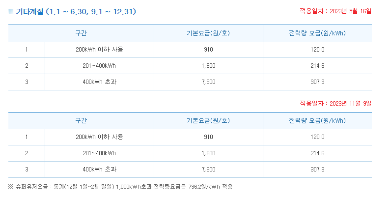 예를들어 1월에 전기사용량이 380kh였다면 kh당 214.6원으로 계산되나, 420kh를 사용했다면 누진구간인 400kh를 초과했기 때문에 kh당 307.3원(1.5배 단가가 비쌈)을 내서 전기요금을 과도하게 부과받을 수 있으니 전력사용량을 체크해 보시면서 사용하시면 요금을 절약하실 수 있습니다.