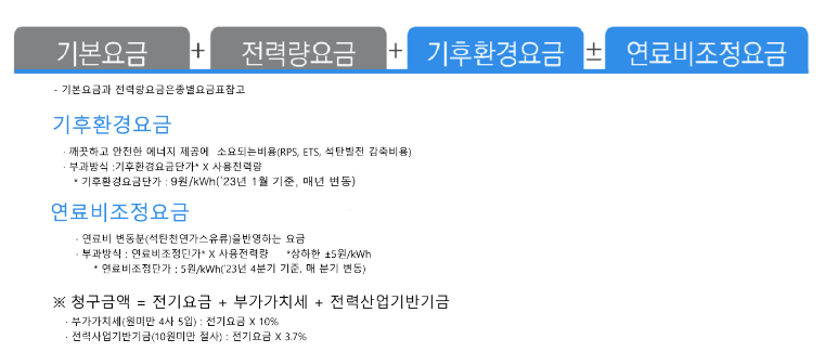 전기요금은 기본요금, 사용량에 따른 요금에 부가가치세 10%, 전력산업기반기금 3.7%를 합산하여 계산되어 청구가 됩니다.