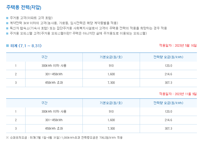일반적인 주택용 전력요금은 주택용 저압에 해당되며, 전기요금이 관리비에 포함되어 청구되는 아파트의 경우 주택용 고압이라 보시면 됩니다.