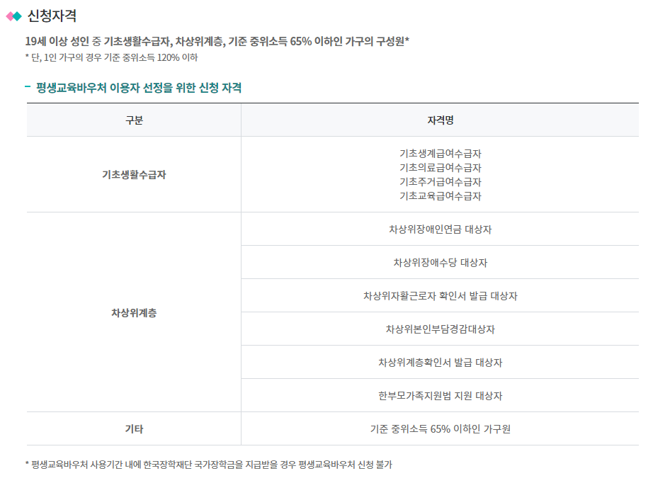 평생교육강좌 수강료 및 해당 강좌 수강에 필요한 교재비에 사용할 수 있는 평생교육바우처 지원(1인당 최대 35만 원)합니다. (단, 본인사용 및 수강원칙, 교재단독구매 및 재료비·유무선전자·통신기기, 전자교재(PDF, e-book) 등 사용 불가 합니다.