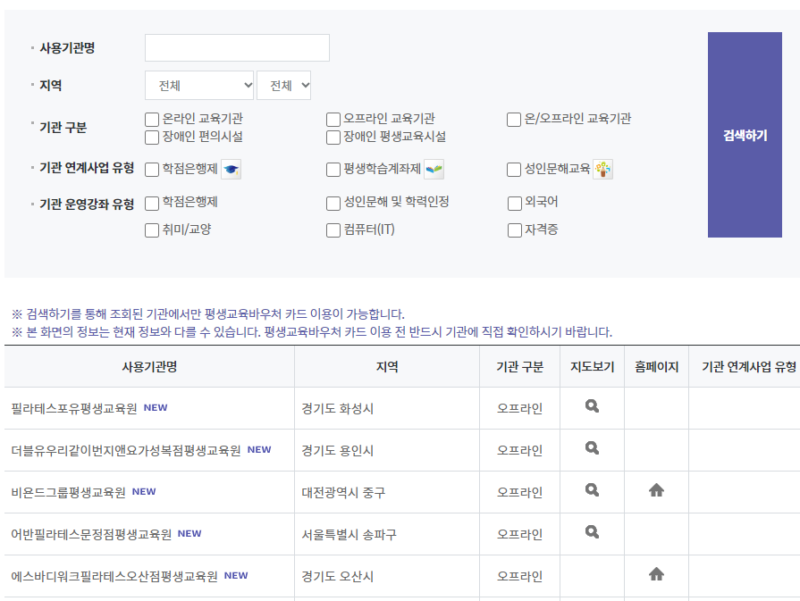 평생교육바우처 사용기관으로 등록된 교육기관에서 사용가능하며, 인근 지역의 이용 가능 기관은 홈페이지에서 확인할 수 있습니다. 온라인 사용은 물론, 오프라인 사용도 가능합니다.