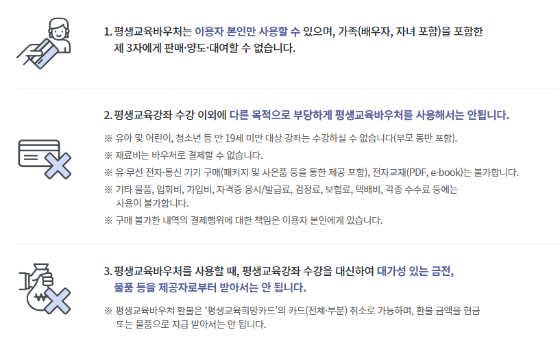 평생교육바우처 이용자 준수사항을 위반할 경우, 평생교육법 제16조의 3(평생교육이용권의 사용 등), 동법 제45조의 3(벌칙) 등 관련 법에 따른 처벌, 평생교육바우처 사용 중지, 부정사용액 등 회수 또는 환수가 이루어지며, 차년도 사업참여가 제한될 수 있습니다.