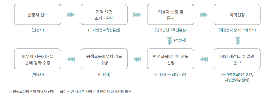 평생교육바우처는 정부에서 학습자의 여건, 교육 수준 등에 따라 평생교육 수단을 자율적으로 결정할 수 있도록 제공하는 바우처입니다. 저소득층 성인의 자기 계발 지원 및 경제적 여건에 따른 교육 참여율 차이를 줄여주는 제도입니다.