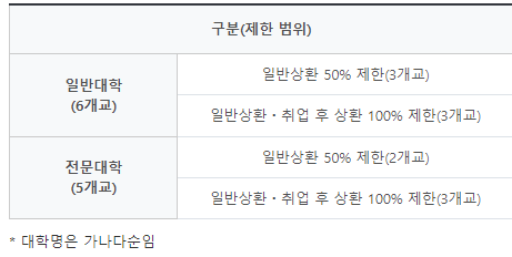 학자금 지원가능대학과 제한 대학은 아래에서 바로 확인하실 수 있습니다.