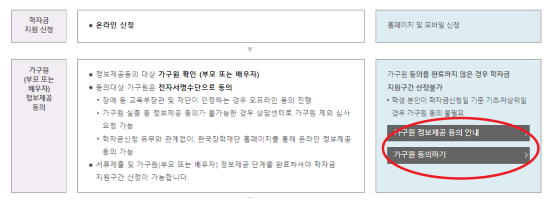 1. 홈페이지 및 모바일에서 학자금 지원 신청 및 가구원 정보제공 동의 합니다.