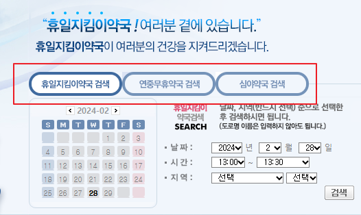 ✔ 휴일지킴이 약국은 연중무휴로 운영 중인 약국을 검색하는 연중무휴약국검색과 특정 시점에 운영 예정인 약국을 검색하는 휴일 지킴이약국 검색이 있습니다.