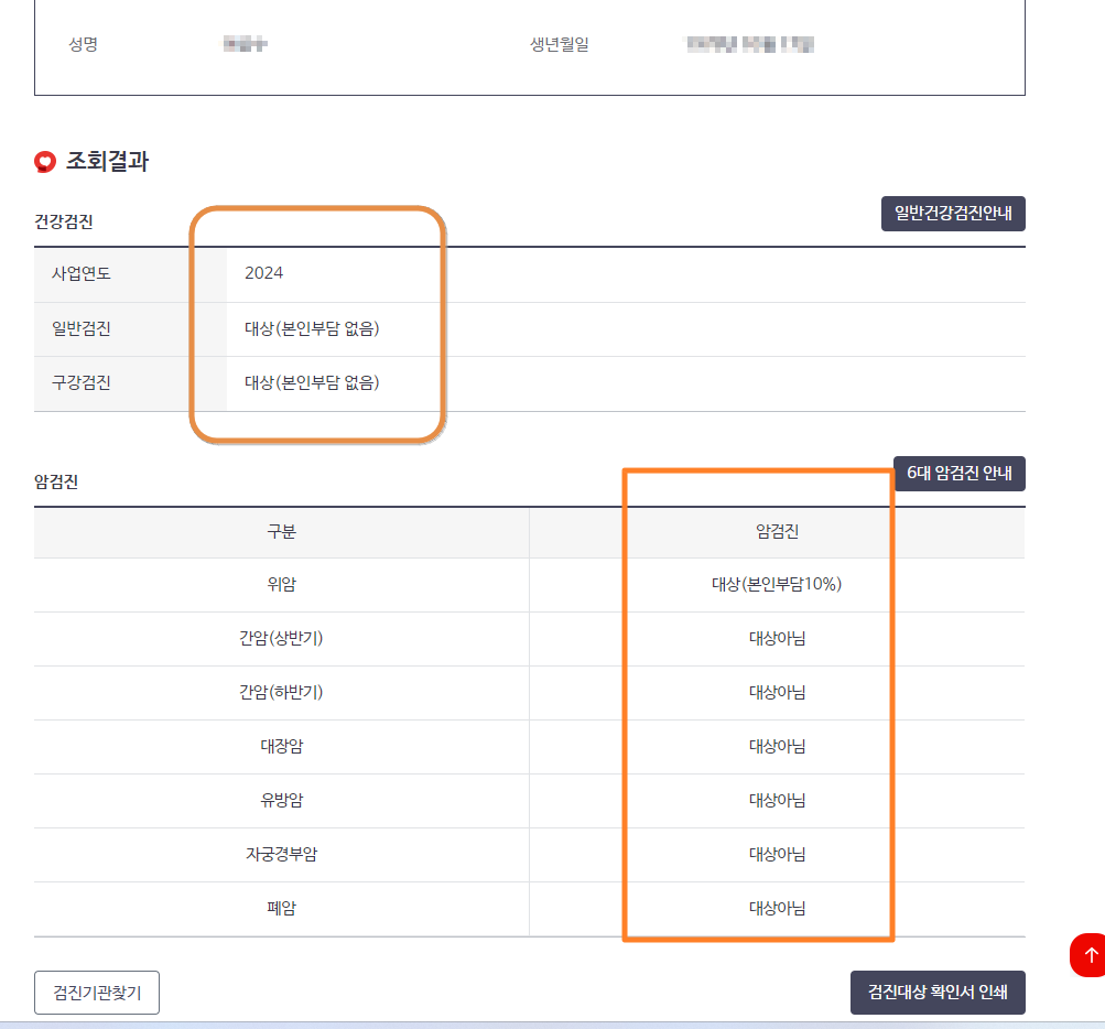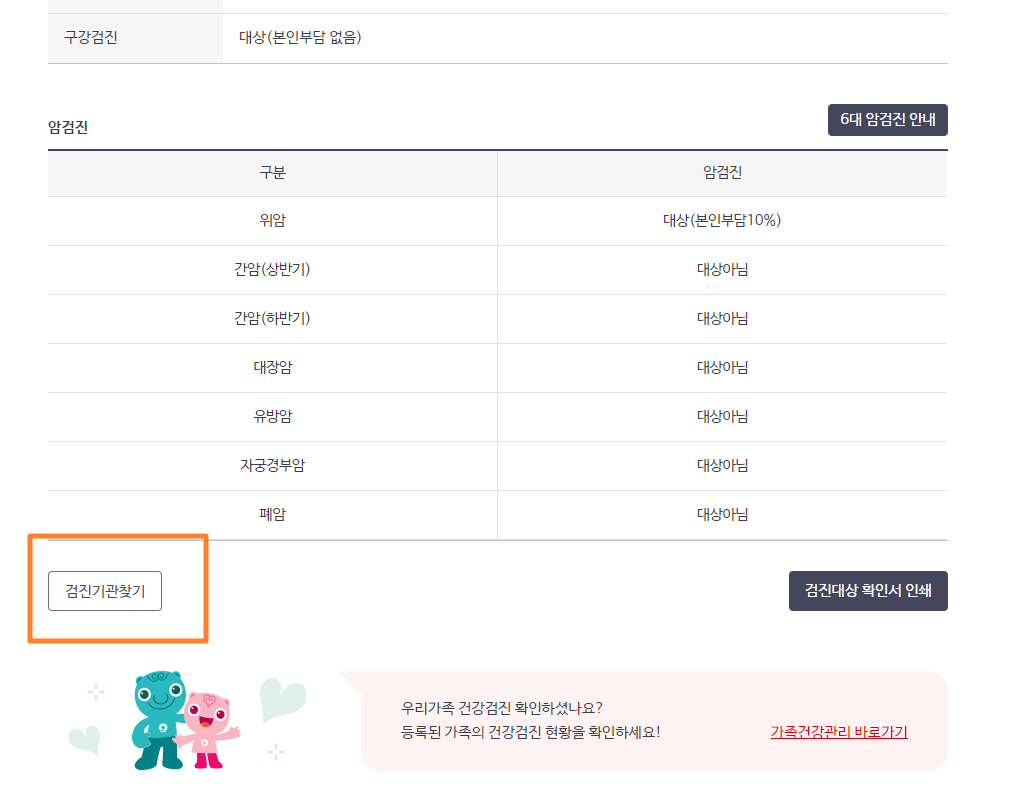 *건강검진 대상자라면 본인의 이름과 함께 검진항목이 나오게 됩니다. 대상자가 아니면 '건강검진 대상자가 아닙니다'라는 문구가 나옵니다.