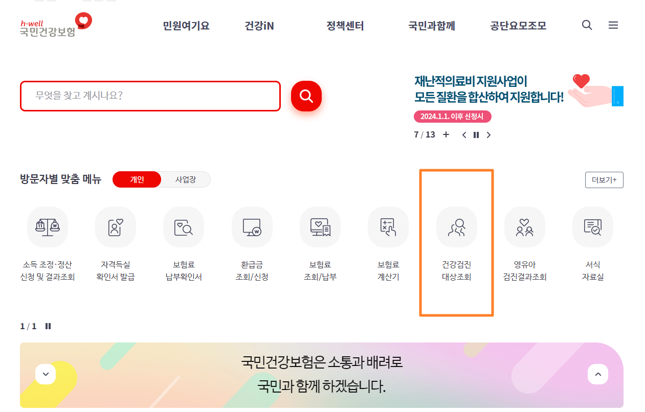 1.'국민건강보험 홈페이지'에 접속 후 '건강검진 대상조회'를 선택합니다