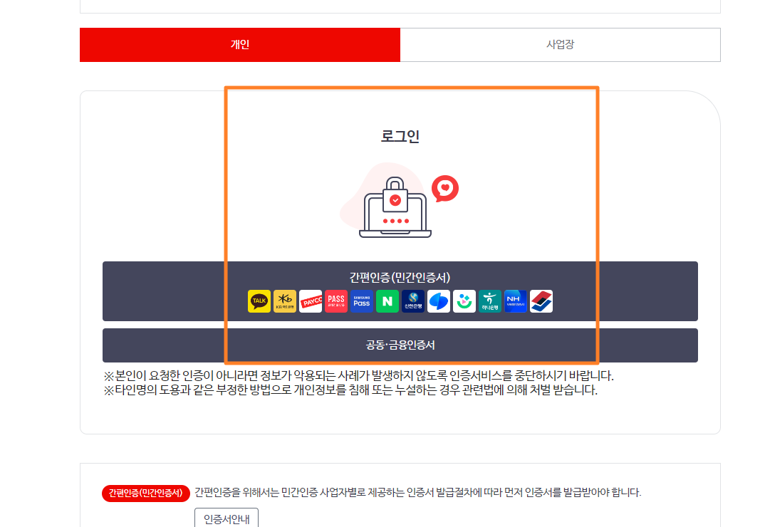 2. '간편인증' 또는 '공동, 금융인증서'를 통해 로그인을 진행합니다.