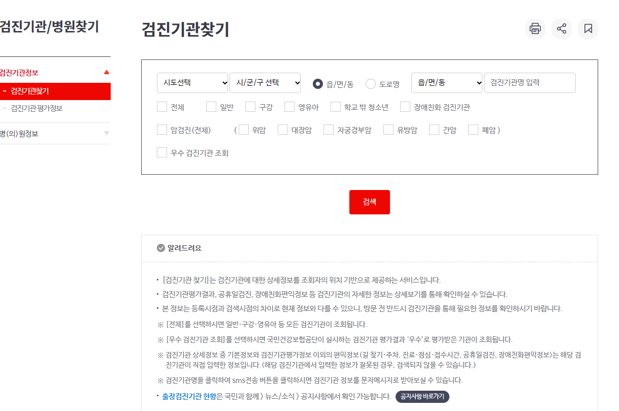 1. 검강검진 대상자 조회를 완료하시면 아래와 같이 '건강검진 기관 찾기' 검색창을 이용하시면 됩니다.