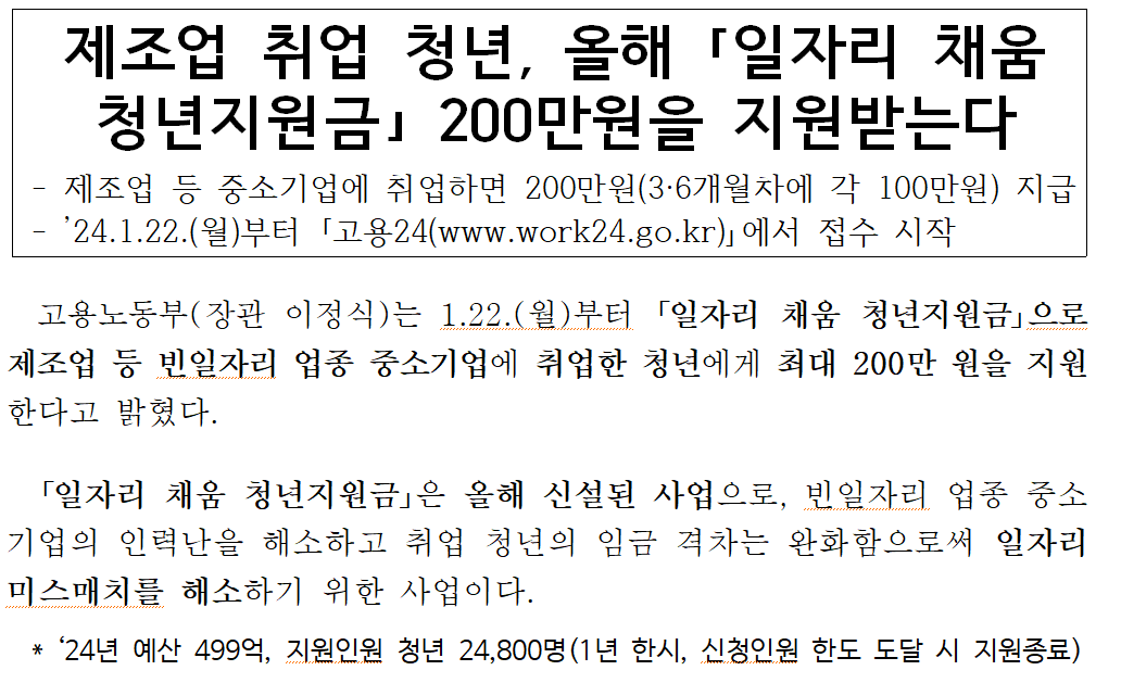 일자리 재움 청년지원금은 2024년 신설한 사업으로, 빈일자리 업종* 중소기업의 인력난을 해소하고 취업 청년의 임금 격차를 완화하기 위해 빈일자리 업종에 취업한 청년에게 최대 200만 원을 지급하는 사업입니다. 또한, 다른 지원금과 중복하여 지원을 허용하는 사업입니다.