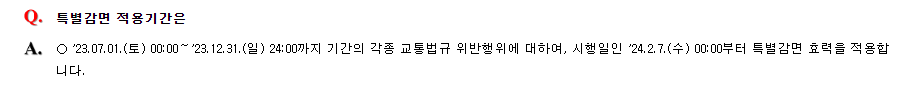 ⇨ ’23.07.01.(토) 00:00~’ 23.12.31.(일) 24:00까지 기간의 각종 교통법규 위반행위에 대하여, 시행일인 ’ 24.2.7.(수) 00:00부터 특별감면 효력을 적용합니다.