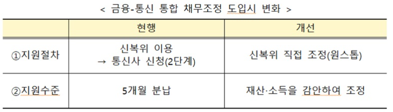금융위원회가 과학기술정보통신부와 협업해 신용회복위원회가 금융채무와 통신채무를 동시에 조정하는 ‘금융-통신 통합채무조정’을 2024년 2분기 중 시행할 계획이라고 합니다.