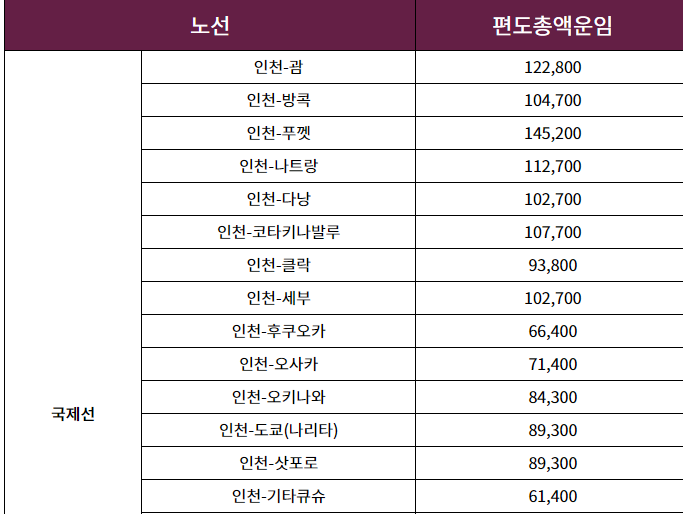 인천 > 광, 방콕, 푸껫, 냐짱, 다나 크타기나발루, 클락, 세부